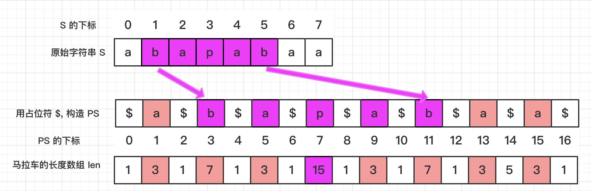 以 S[1:5] 为例,首选换算对应子串位置,得到 PS[3:11],找到PS[3:11]的中心 PS[7],通过查询长度数组 len,得知以 PS[7] 为中心的最长回文串的长度为 15。显然 PS[3:11] 及 S[1:5] 都是回文的。