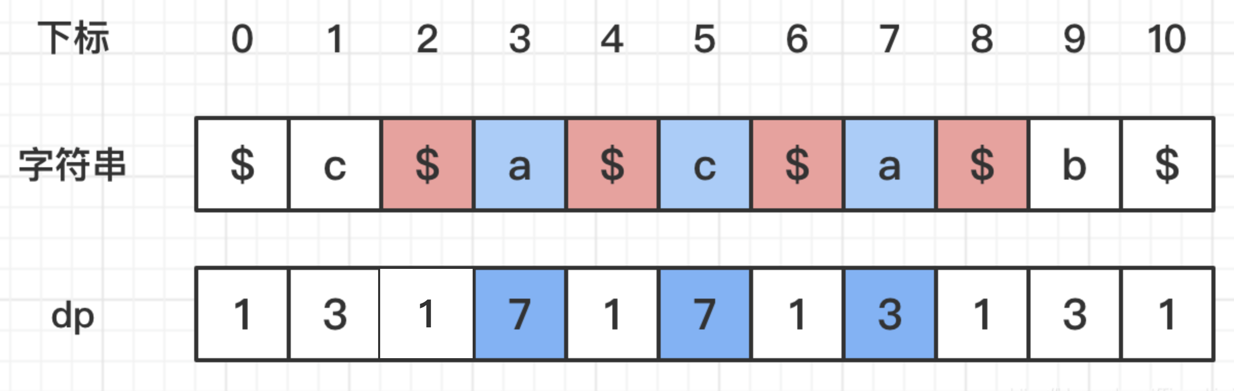 - i_mirror = R+L-i = 14+0-11 = 3,则 dp[3] = 7。