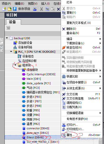 在程序块中右键点击全局数据块,会弹出如下图所示的列表,在列表中点击“属性”按钮
