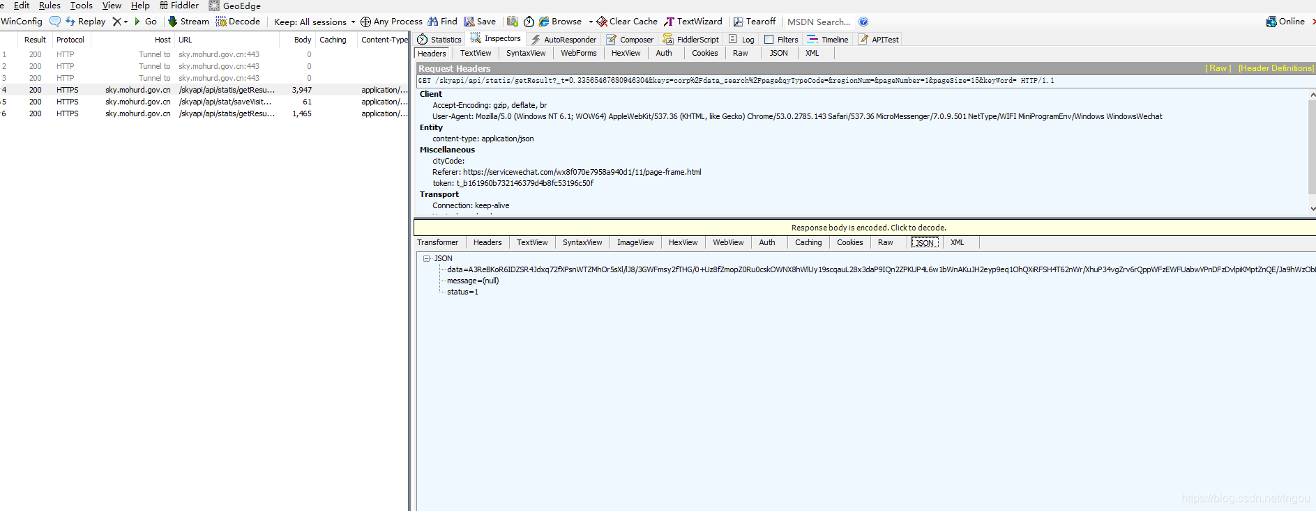 GET https://sky.mohurd.gov.cn/skyapi/api/statis/getResult?_t=0.33565467680946304&keys=corp%2Fdata_search%2Fpage&qyTypeCode=®ionNum=&pageNumber=1&pageSize=15&keyWord= HTTP/1.1 Host: sky.mohurd.gov.cn Connection: keep-alive User-Agent: Mozilla/5.0 (Windows NT 6.1; WOW64) AppleWebKit/537.36 (KHTML, like Gecko) Chrome/53.0.2785.143 Safari/537.36 MicroMessenger/7.0.9.501 NetType/WIFI MiniProgramEnv/Windows WindowsWechat cityCode: content-type: application/json token: t_b161960b732146379d4b8fc53196c50f Referer: https://servicewechat.com/wx8f070e7958a940d1/11/page-frame.html Accept-Encoding: gzip, deflate, br