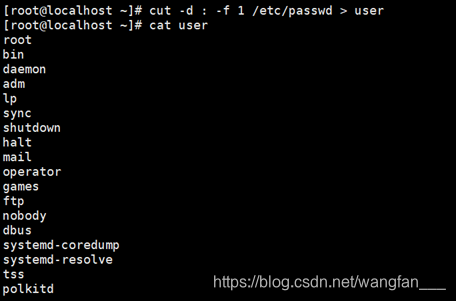 1.将/etc/passwd 中第一个字段(用户名)截取到user文件中