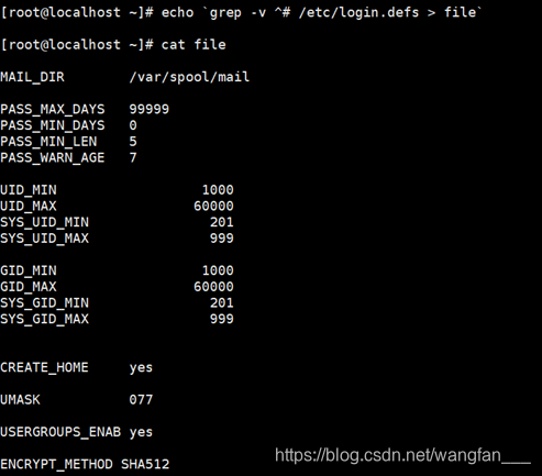 4.通过过滤指令将/etc/login.defs 文件中关键的配置信息显示在file文件中。
