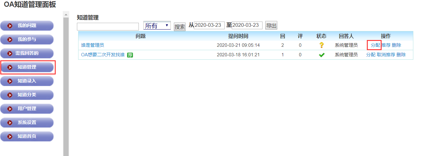 在管理后台的知【道管理】菜单下,增加分配按钮。同时增加许【需我回答的】菜单。