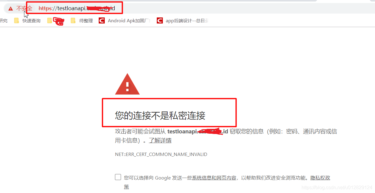 2、一般出此类问题是配置的https证书有问题,在网页上访问https://xxx.id一般出现您的连接不是私密连接如下图所示,可以确定是https证书配置有问题;联系相关人员(一般是公司的运维同学负责)配置好证书即可。