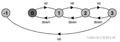 下图描述了信号灯的行为,其中的ERROR状态由state(-1)表示。事实上,由于FSP编译器会自动将未定义的状态映射到ERROR状态,我们可以省略最后一行描述,并将信号灯的模型更简洁地描述为: