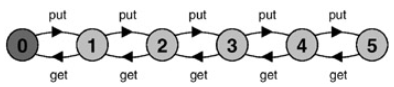 有边界的缓冲区的生产者——消费者系统是一个处理数据项而不改变它们的程序的例子。此外,生产者、消费者和缓冲区本身的行为不受他们处理的项目的价值影响。换句话说,他们不测试这些数据项的值。这种行为被说成是与数据无关的。如果可以建立数据独立性,那么模型可以通过省略参数和数据结构的详细表示来简化。这将导致更小、更易操作的模型。下面第一张图中的get和put操作是没有参数的简单动作。下面第二张图中描述的有界缓冲区系统的LTS应该与停车场LTS进行比较,以看到这两个系统的同步行为的相似性。