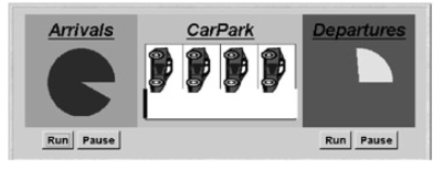 Arrivals和Departures是ThreadPanel类的实例,carDisplay是CarParkCanvas的实例,如类图所示。