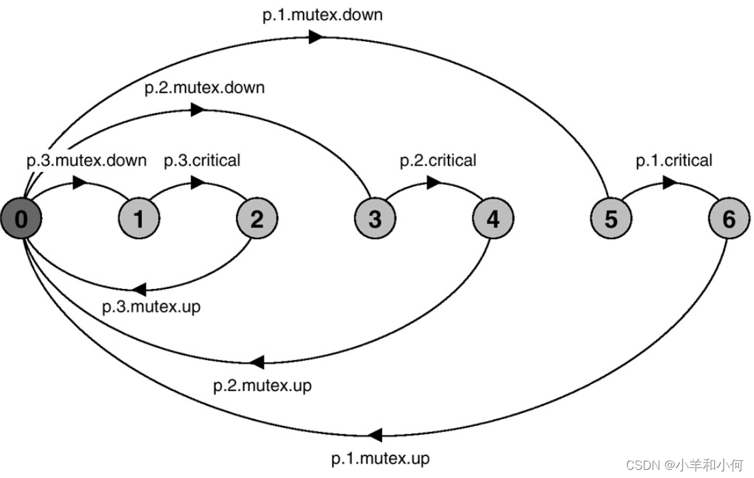 下图描述了一个模型,其中三个进程p[1...3]使用一个共享的semaphore mutex来确保对一些资源的互斥访问。每个进程执行mutex.down动作来获得排他性访问,mutex.up动作来释放它。对资源的访问被建模为动作critical(用于访问共享资源的代码的关键部分)。每个进程的模型如下所示: