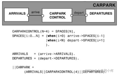 停车场控制必须只允许在停车场有空间时发生到达行动,在停车场有车时发生离开行动。这表达了其他进程在与停车场交互时必须满足的同步条件。