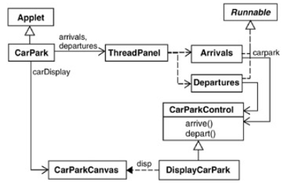 正如我们将在随后的例子中看到的,在模型中哪些进程在实现中成为线程,哪些成为监视器,这个决定并不总是很明确。然而,在停车场的例子中,这个决定是明确的。发起到达和离开动作的进程ARRIVALS和DEPARTURES应该作为线程来实现。响应到达和离开动作的CARPARKCONTROL进程应该是一个监视器。下图描述了停车场程序的类结构。