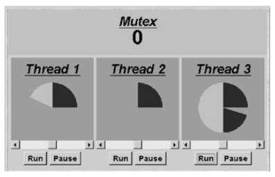在其关键部分执行的线程由浅色段表示。每个线程的显示都是逆时针旋转的。在上图中,线程1正在其关键部分执行,线程2被阻塞,等待进入其关键部分,线程3已经完成其关键部分,正在执行非关键动作。每个线程下面的滑块可以调整线程执行关键动作的时间,而不是非关键动作。