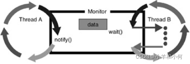 如果被当前不 "拥有 "监视器的线程(即之前没有通过执行同步方法或语句获得同步锁的线程)调用,则操作失败。我们指的是,当一个线程获得与监视器相关的互斥锁时,它就进入了监视器,当它释放锁时,就退出了监视器。从上面的定义可以看出,调用wait()的线程会退出监视器。这允许其他线程进入监视器,当满足适当的条件时,可以调用notify()或notifyAll()来唤醒等待的线程。下图中描述了wait()和notify()的操作。