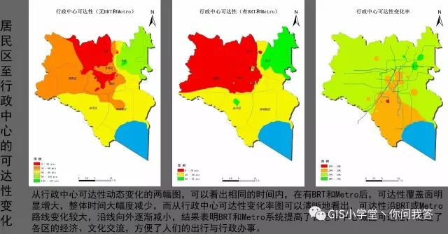 再利用空间分析反距离加权插值(IDW)功能,得到居民点到CBD(中央商务区)、商业中心、行政中心、工业中心的可达性空间分布专题图。并且比较了在有无BRT和Metro路线时的居民可达性变化。