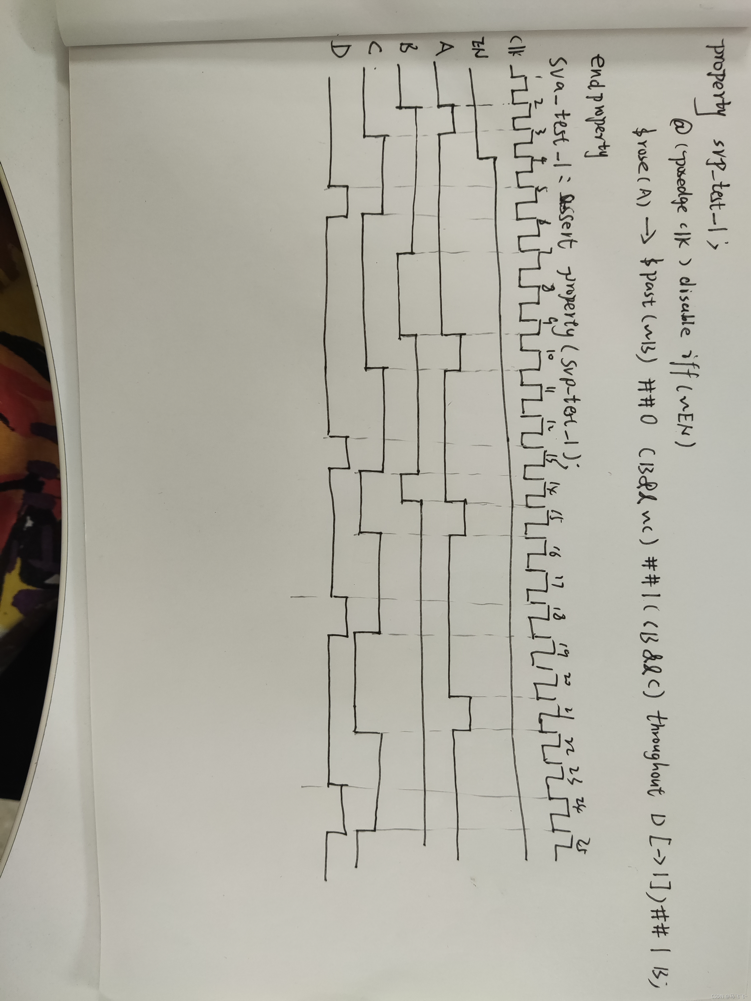 如图所示,本条断言的意思大体是,EN信号高电平有效,等到A上升沿的时候,其前一个周期(~B)成立,等待0个周期,(B&&~C)成立,等待1个周期,D为1的过程中,(B&&C)语句一直成立,等待1个周期,B成立。