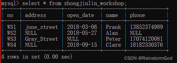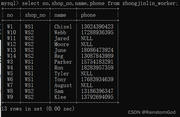 select no,shop_no,name,phone from zhongjinlin_worker;