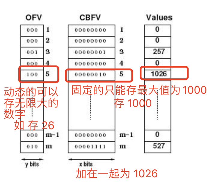 DCF(Dynamic Count Filter): 其实就是 将 bit位 存的 count值 分别放在 2个列表中; 一个列表 每个数据的 最大值固定(也就是bit位的个数固定); 另一个列表 每个数据 最大值不固定(bit为个数不固定); 2个列表 对应数据 相加 就是 count的值; 存数据时 优先存在固定长度的列表中,存不下再放在 不固定列表中;