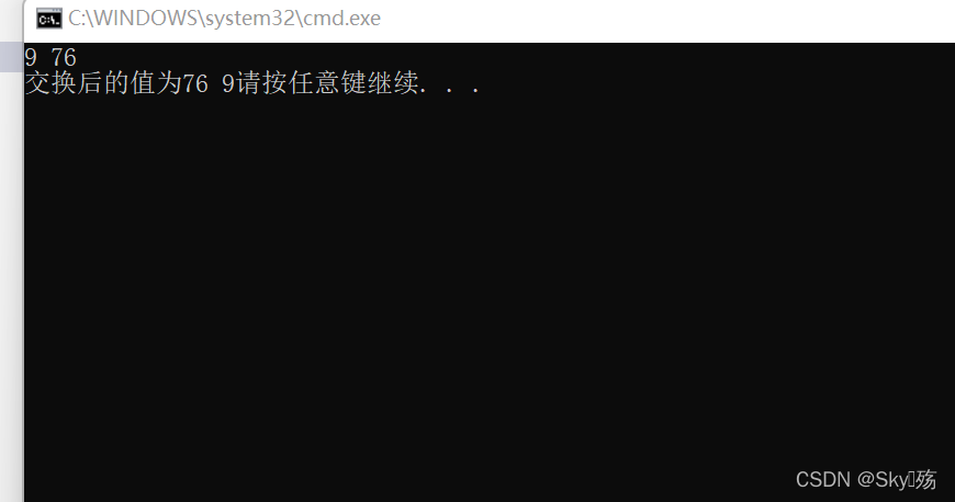 {int data1 = 0, data2 = 0;scanf_s("%d %d", &data1, &data2);int change = 0;change = data1;data1 = data2;data2 = change;printf("交换后的值为%d %d", data1, data2);return 0;