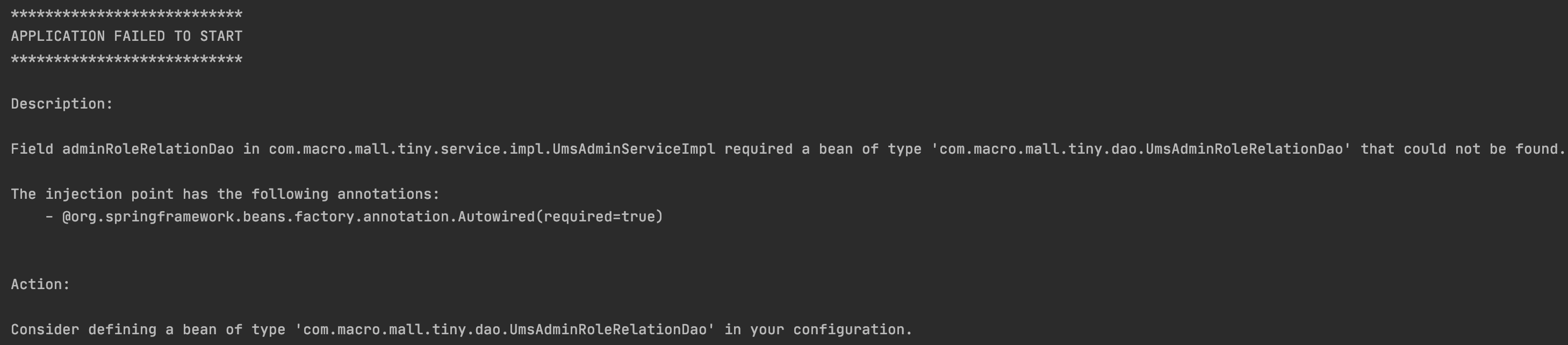 ***************************Description:Field adminRoleRelationDao in com.macro.mall.tiny.service.impl.UmsAdminServiceImpl required a bean of type 'com.macro.mall.tiny.dao.UmsAdminRoleRelationDao' that could not be found.The injection point has the following annotations:- @org.springframework.beans.factory.annotation.Autowired(required=true)Action:Consider defining a bean of type 'com.macro.mall.tiny.dao.UmsAdminRoleRelationDao' in your configuration.