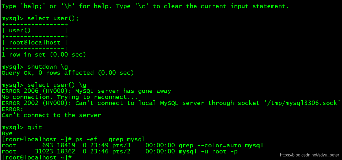 4.mysql>shutdown \g (把mysqld_safe和mysqld一起干掉了😓,剩下另一个MySQL client程序孤苦伶仃)