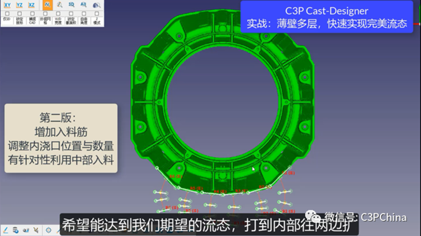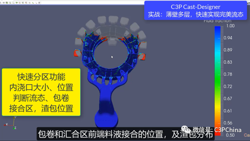 在前期设计中,多口进浇的内浇口位置、大小,是获得平稳流态的关键。如果通过模拟分析,通常需要几个小时。修改方案又要几个小时。Cast-Designer v7.5 新出的“快速铸造分区”功能,只需要把内浇口搭在铸件上,就可以分析,对于设计前期,具备非常高的参考性和指导意义。