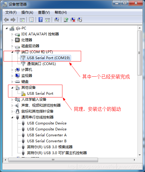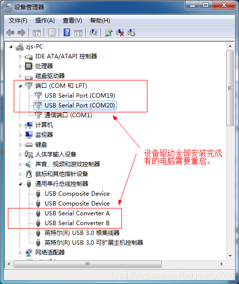 其中我的电脑com口为COM19和COM20,每个电脑出现的号不一定相同。至此所有驱动安装完成。