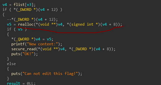Edit的时候,调用了realloc,并且没有检查size是否为0,如果为0,则这个chunk会被free掉,但是堆指针没有从flist堆数组里移除,这就造成了UAF。
