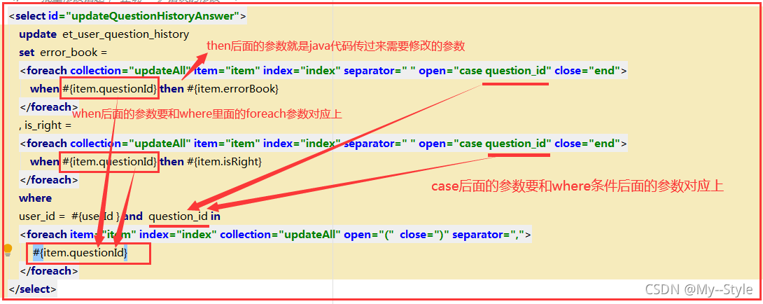 <select id="updateQuestionHistoryAnswer">update et_user_question_historyset error_book =<foreach collection="updateAll" item="item" index="index" separator=" " open="case question_id" close="end">when #{item.questionId} then #{item.errorBook}</foreach>, is_right =<foreach collection="updateAll" item="item" index="index" separator=" " open="case question_id" close="end">when #{item.questionId} then #{item.isRight}</foreach>whereuser_id = #{userId } and question_id in<foreach item="item" index="index" collection="updateAll" open="(" close=")" separator=",">#{item.questionId}</foreach></select>