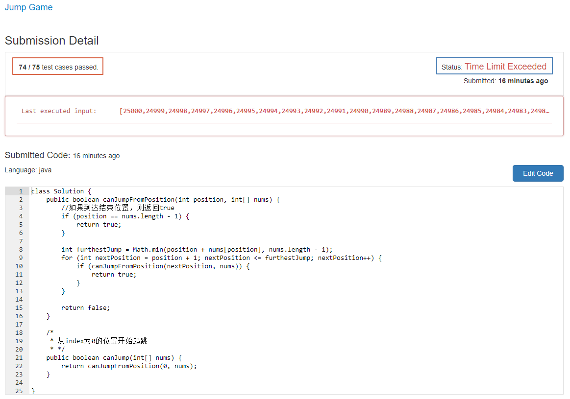 /** 从index为0的位置开始起跳* */public boolean canJump(int[] nums) {return canJumpFromPosition(0, nums);}/** 采用回溯算法(Backtracking),这是一个效率低下的解决方案。* 思路:* 尝试从第一个位置到最后一个位置的每一个跳跃模式。* 从第一个位置开始,跳到所有可以到达的索引。 * 重复这个过程,直到到达最后一个索引。 * 卡住时,回退。*/public boolean canJumpFromPosition(int position, int[] nums) {//如果到达结束位置,则返回trueif (position == nums.length - 1) {return true;}int furthestJump = Math.min(position + nums[position], nums.length - 1);for (int nextPosition = position + 1; nextPosition <= furthestJump; nextPosition++) {if (canJumpFromPosition(nextPosition, nums)) {return true;}}return false;}