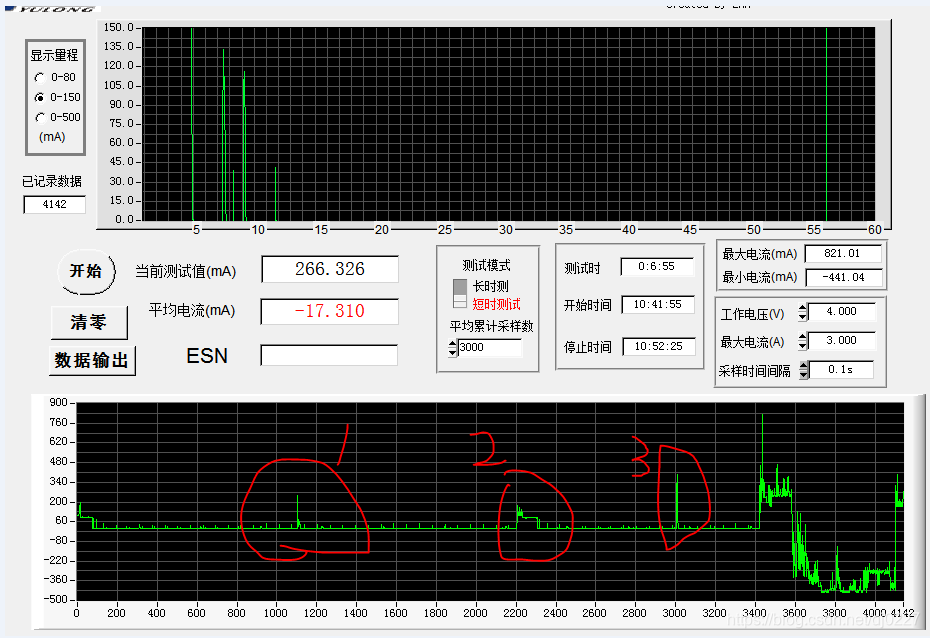 通过比对电流图,可见从1到2经历1min50s,从2到3经历70s,而从3到按键点亮屏幕,经历40s;