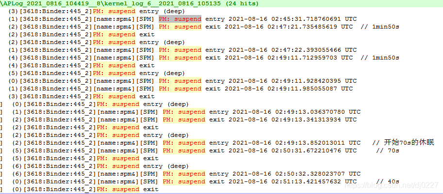 首先查看kernel log; 由于在抓取时,通过按键点亮屏幕,因此在kernel log中寻找按键中断则可以确定时间区域;清理掉无关log之后,搜索"PM: suspend":