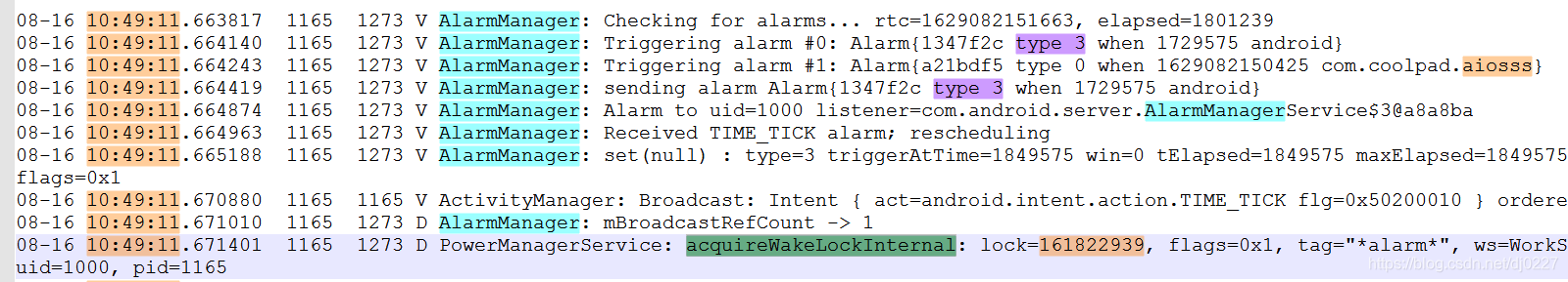 这里有两个alarm,type 3是唤醒源;在AlarmManager log中,奇数次的type是能够影响电流的,而偶数次的type影响不大,比如type 0, type 2不会影响,而type 1, type 3则会影响;可见唤醒的是android这个进程。从PowerManagerService中也能看到一个持锁,但是这个持锁很快就释放了,因此怎么会有10s宽度的电流呢?这个1min50s之后的2处的唤醒时怎样形成的呢?我们已经确定时间了,是10:49:11,但是我们在上层log中发现的信息很有限,支撑不了10s的理由。那么继续在kernel中看。