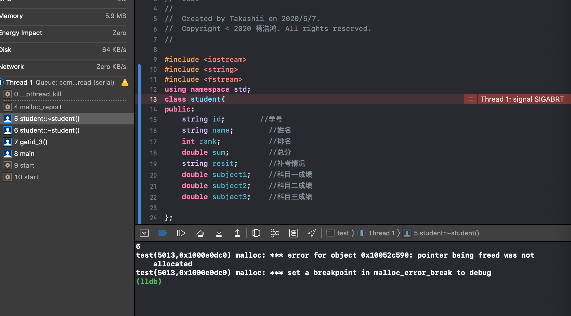 把string 换成char[], 也可解决问题。实际上就是,当类中使用string时,string本质上是一个指针,动态申请内存。使用read函数的时候,产生sentry对象,当超过sentry对象的生存期时,sentry对象被析构,string所指的内存被释放。 如果是使用student 类对象stu,在sentry对象析构之后,程序结束,stu析构,string所指地址被析构两次,出错。 如果是使用student类指针动态申请内存,当超过匿名对象的生存期时,匿名对象被析构,string所指的内存被释放,但是不进行delete,因此不会重复释放。若采用delete,则会重复释放。