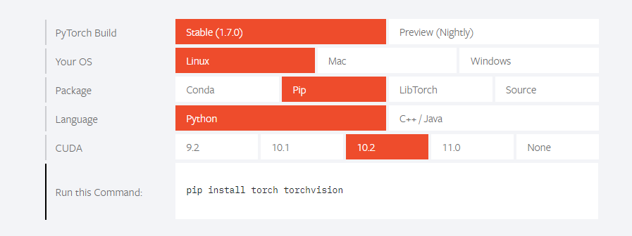 进入官网,找到下面的页面,选择要安装的版本,根据给出的command来进行安装,eg:pip install torch torchvision