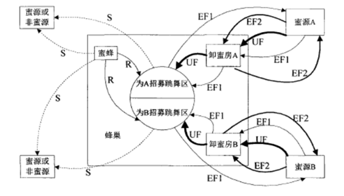 招募区跳摇摆舞,招募一些待在蜂巢中跟随峰,带领其再次返回所发现的蜜源如图中的路线;③不招募其他蜜蜂,继续回到原来的蜜源采蜜如图中的路线。在现实生活中并不是所有的蜜蜂一开始就立刻采蜜,另外大多数蜜蜂在一次采蜜完成后都会选择回到招募区跳摇摆舞来招募更多的蜜蜂去采蜜。