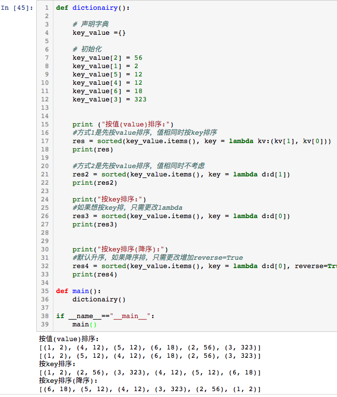 def dictionairy(): # 声明字典key_value ={} # 初始化key_value[2] = 56 key_value[1] = 2 key_value[5] = 12 key_value[4] = 12key_value[6] = 18 key_value[3] = 323 print ("按值(value)排序:") #方式1是先按value排序,值相同时按key排序res = sorted(key_value.items(), key = lambda kv:(kv[1], kv[0]))print(res)#方式2是先按value排序,值相同时不考虑res2 = sorted(key_value.items(), key = lambda d:d[1])print(res2)print("按key排序:")#如果想按key排,只需更改lambdares3 = sorted(key_value.items(), key = lambda d:d[0])print(res3)print("按key排序(降序):")#默认升序,如果降序排,只需更改增加reverse=Trueres4 = sorted(key_value.items(), key = lambda d:d[0], reverse=True)print(res4)def main(): dictionairy() if __name__=="__main__": main()