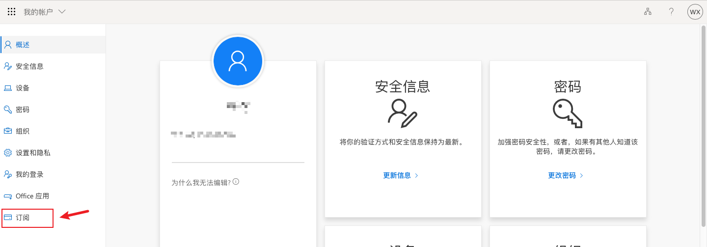 https://portal.office365.com登录自己的office,点击头像,查看账户