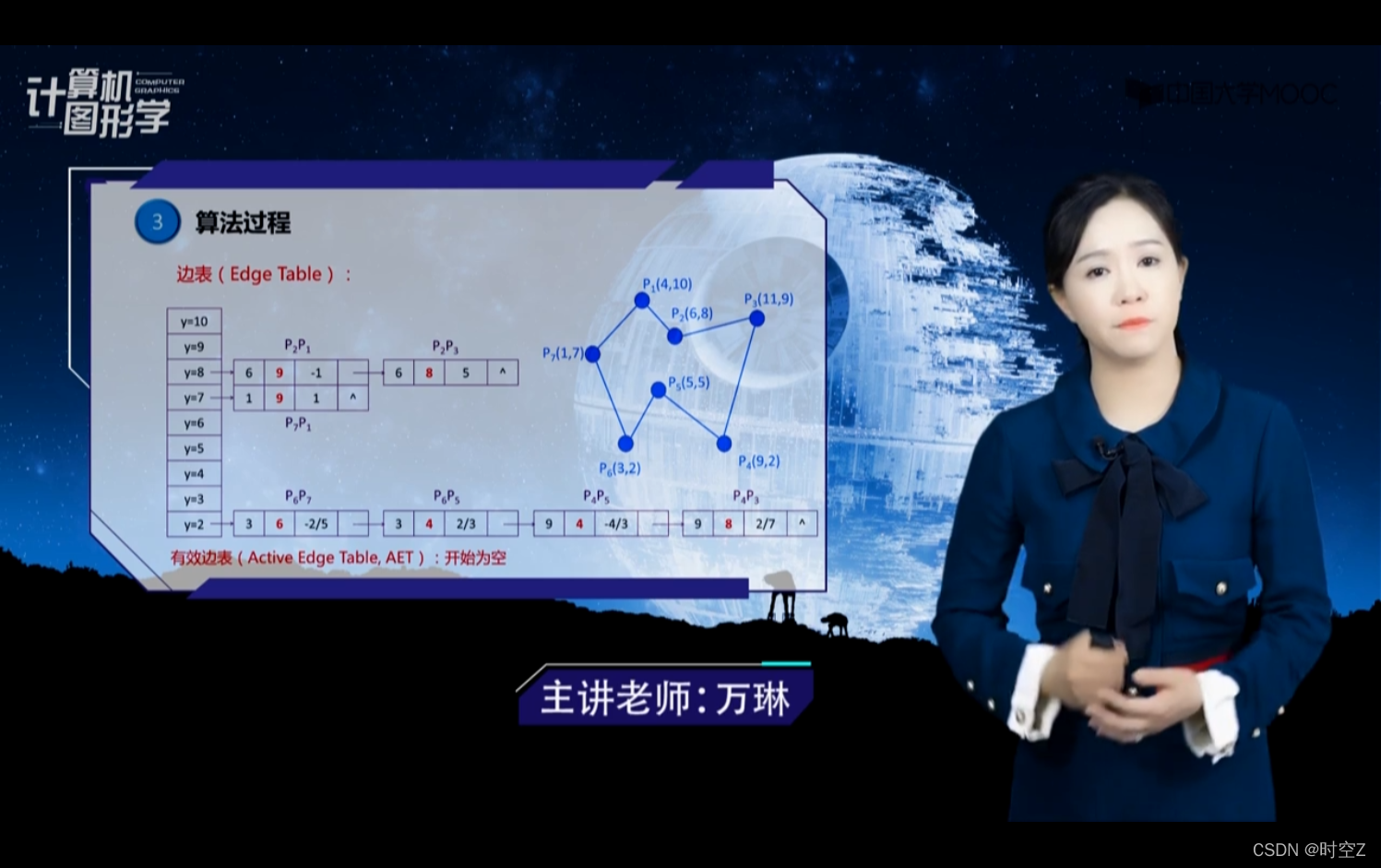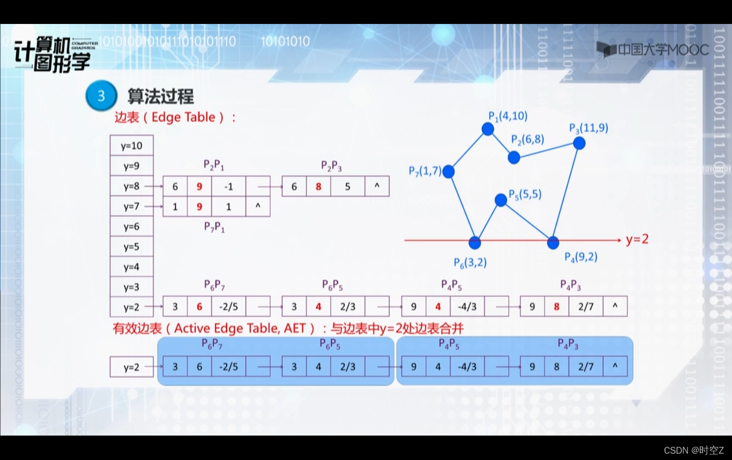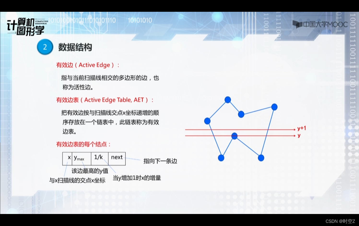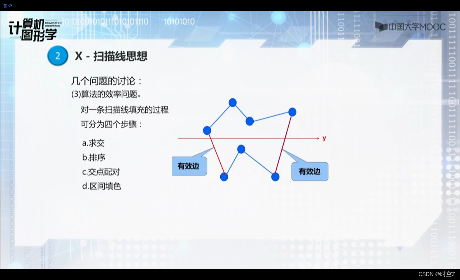 对于这一条扫描线,只需要求与这两条边的焦点,这时这两条边叫做"有效边"
