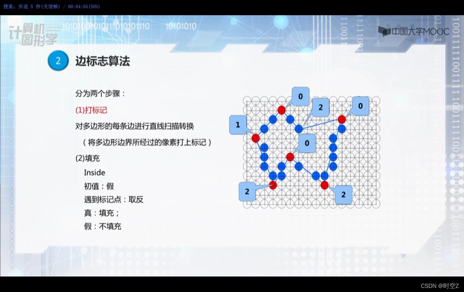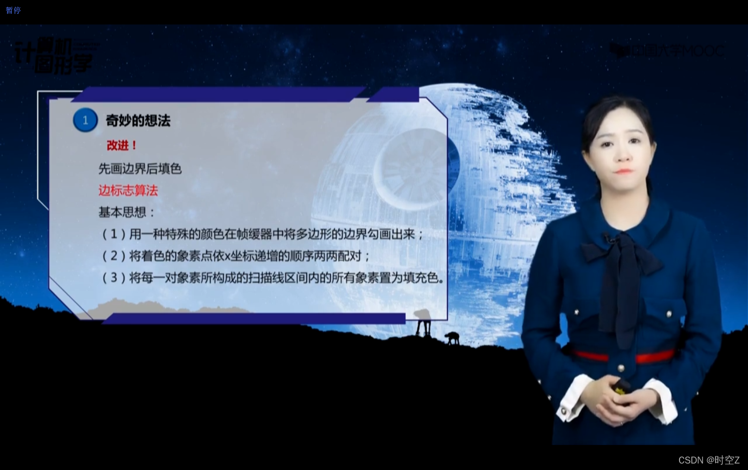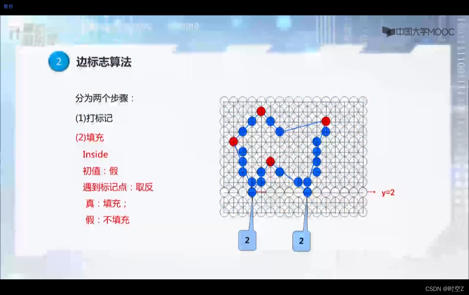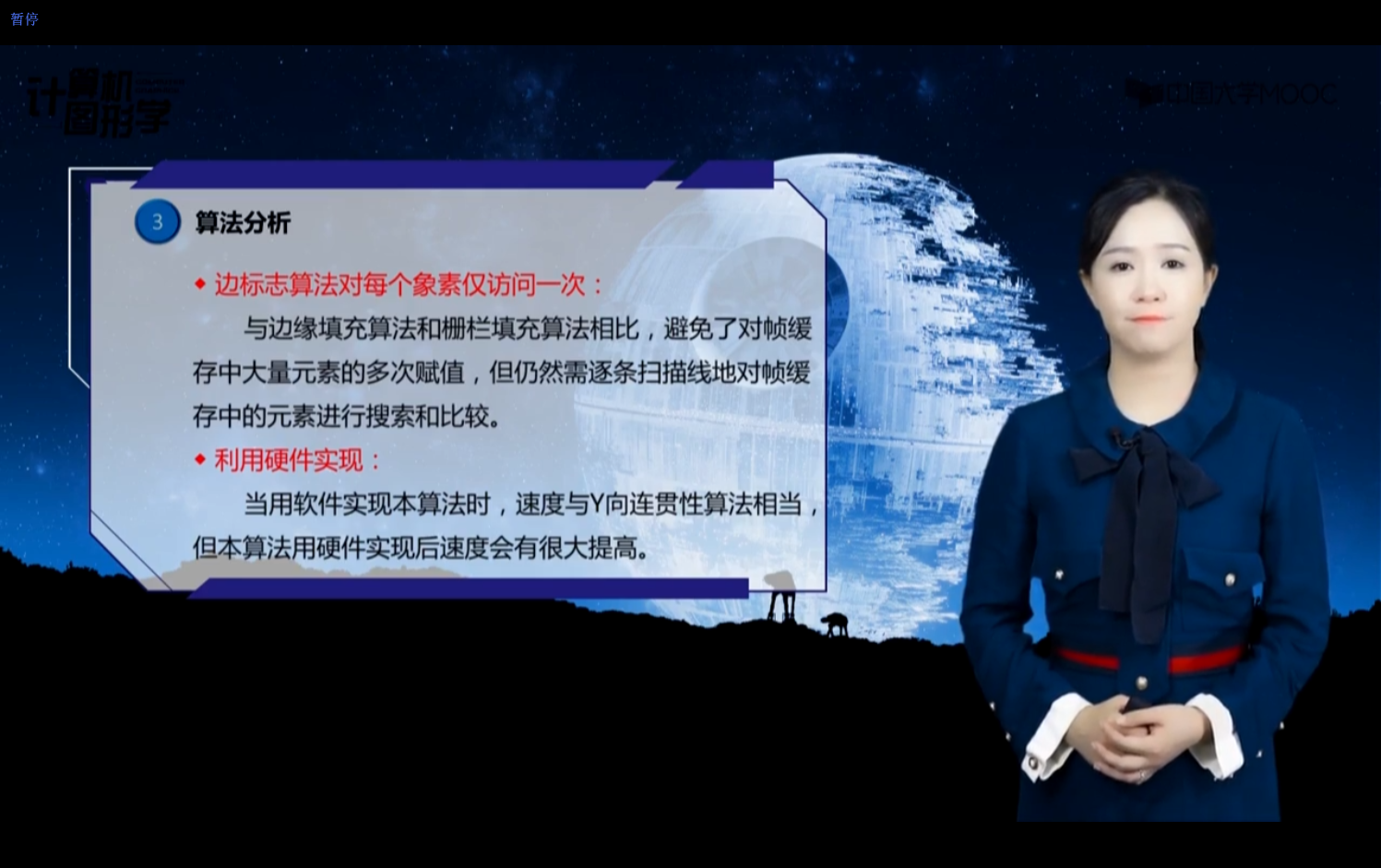 先画边界后填色,这样就可以对帧缓冲器的每一个元素的赋值次数不超过两次,实现这个方法的算法就叫做"边标志算法"