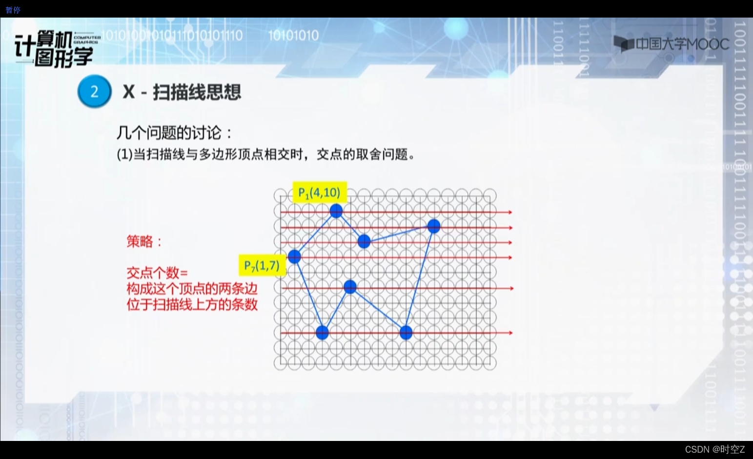 对每一条与多边形相交的扫描线,依从左到右的顺序,按照左闭右开的原则,对扫描线上的像素点进行填色,这里可以使用一个布尔量_Inside来指示当前点的状态