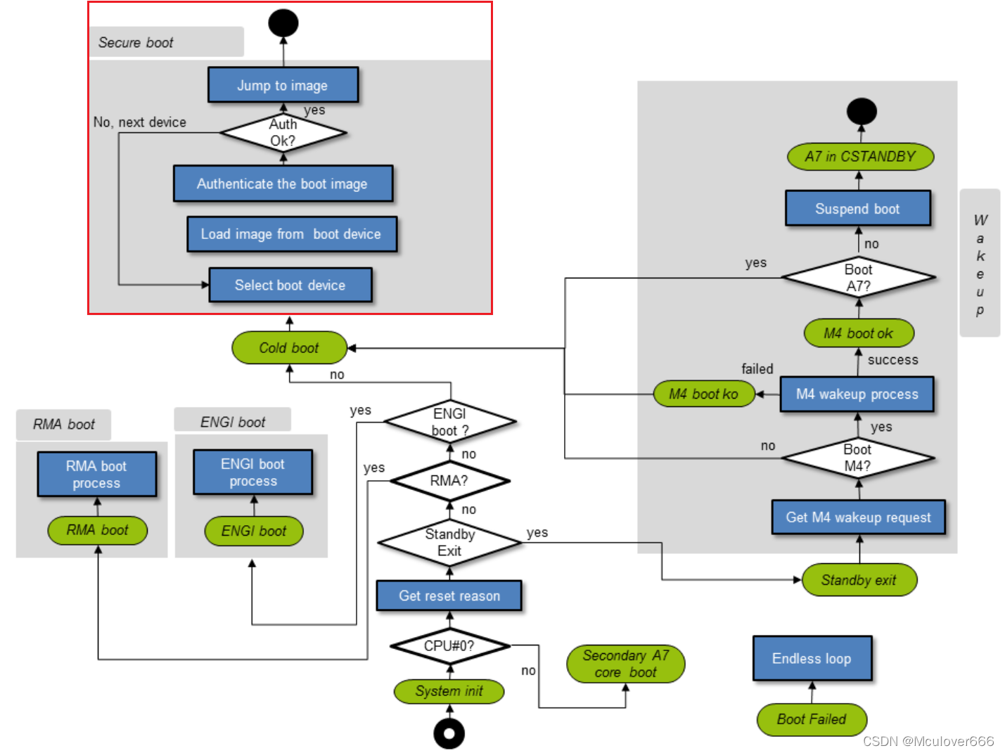 STM32MP157是判断是否在第一个核上运行、是否启动M核、是否RMA、是否ENGI,这些对我们来说都不太重要,默认它一路绿灯就好了,重点要关注红框中的冷启动部分。