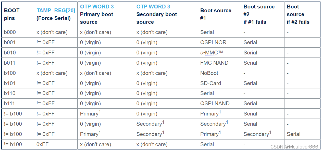 OTP是用于固化的,暂且不管,只看Boot pins的对应情况即可,只需要关注三个即可: