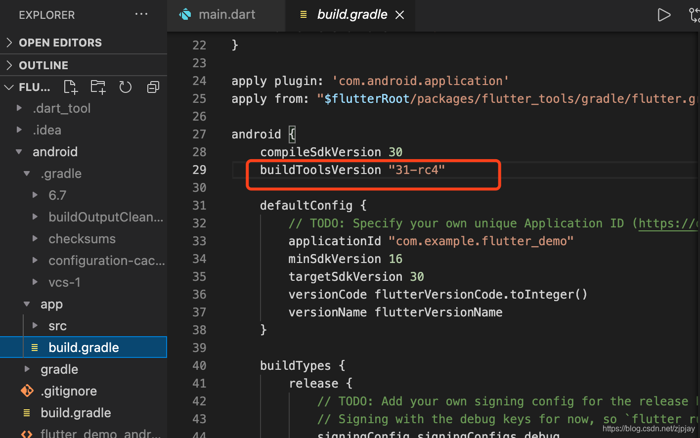 在flutter的项目过程里面找到app->build.gradle->android