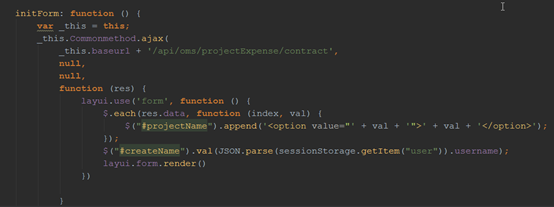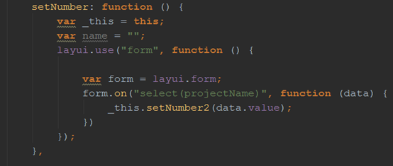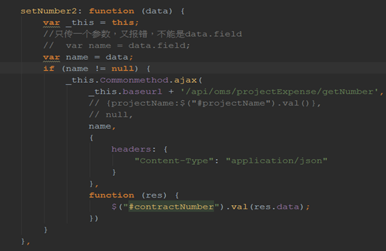 先查到所有合同名称,下拉框选择某一合同名称后,选择时间触发,运行setNumber方法,方法是根据合同名称得到合同编号。