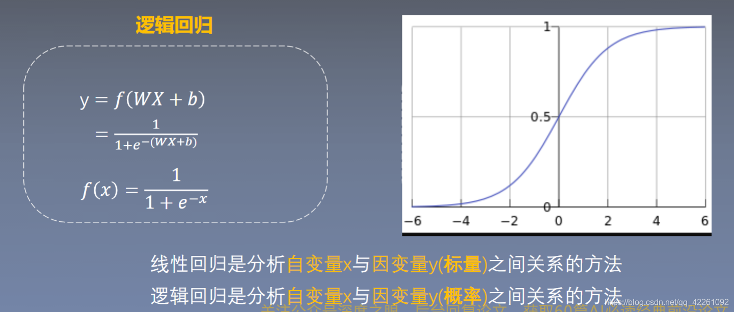 - 逻辑回归又叫对数几率回归,几率即为y/1-y(概率取值y除以1-y)表示样本x为正样本的可能性。线性回归用wx+b去拟合Y,而逻辑回归是用wx+b去拟合一个对数几率