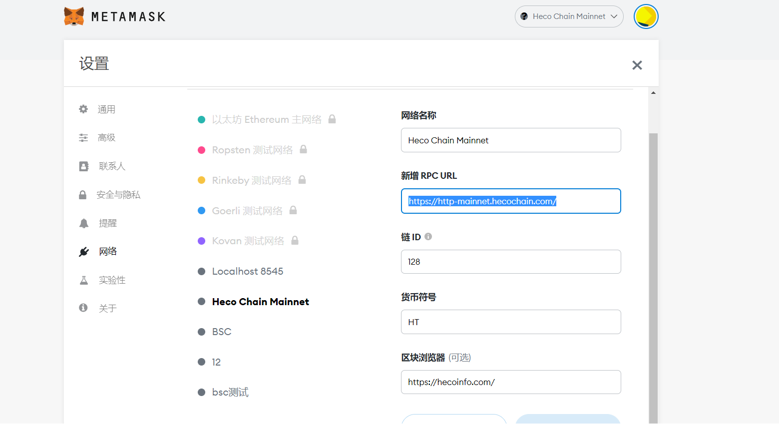网络名称: heco主网 新增RPC: https://http-mainnet.hecochain.com/