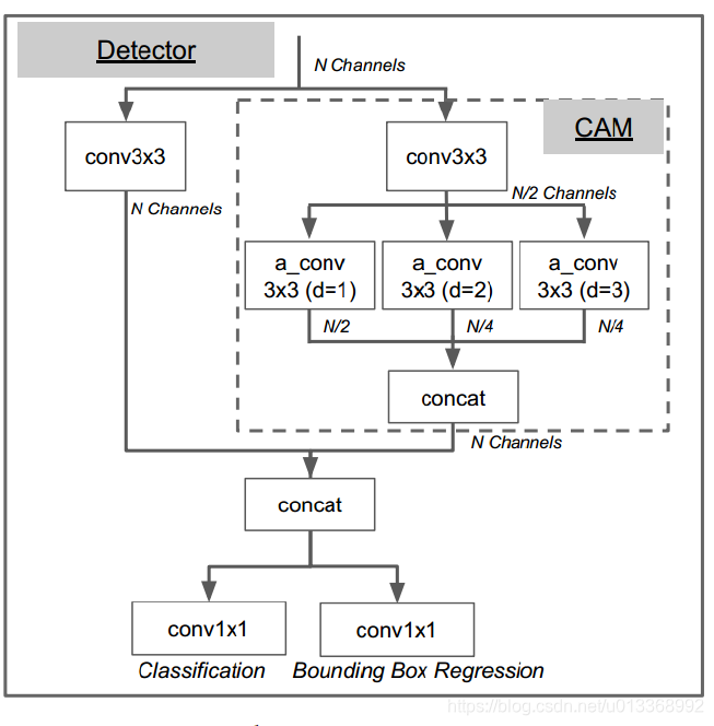 CAM是上下文信息回归模块,整合候选框周围的上下文信息。其中使用了空洞卷积增加了感受野。