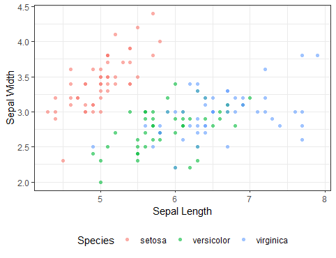 p <- ggplot(iris) +geom_point(aes(x = Sepal.Length, y = Sepal.Width, color = Species), alpha = 0.6, shape = 16) + # alpha 调整点的透明度;shape 调整点的形状theme_bw() +theme(legend.position = "bottom") + # 图例置于底部labs(x = "Sepal Length", y = "Sepal Width") # 添加x,y轴的名称