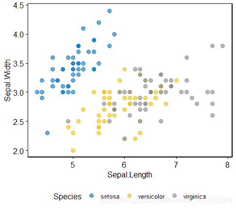 sp <- ggscatter(iris, x = "Sepal.Length", y = "Sepal.Width",color = "Species", palette = "jco",size = 3, alpha = 0.6) +border() +theme(legend.position = "bottom")