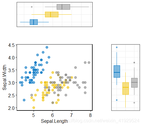 pmain <- ggplot(iris, aes(x = Sepal.Length, y = Sepal.Width, color = Species)) +geom_point() +color_palette("jco")