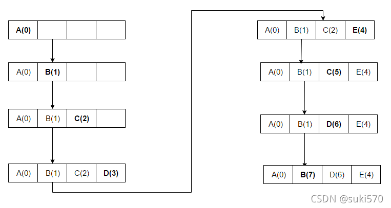 在上面的例子中,一旦 A B C D 被安装在具有序列号的块中(每个新访问增加 1),当访问 E 时,它是一个未命中,它需要安装在其中一个块中。 根据 LRU 算法,由于 A 的 Rank(A(0)) 最低,E 将替换 A。